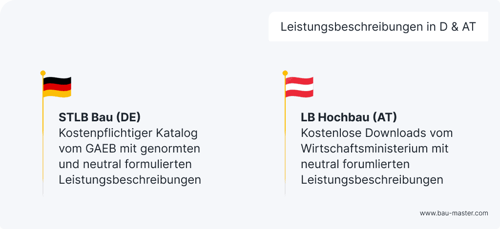 In Österreich gibt es die standardisierten Leistungsbeschreibungen unter der Bezeichnung “LB Hochbau”. Diese Leistungsbeschreibungen für Bauleistungen werden vom Bundesministerium für Arbeit und Wirtschaft kostenlos auf der Homepage zur Verfügung gestellt.