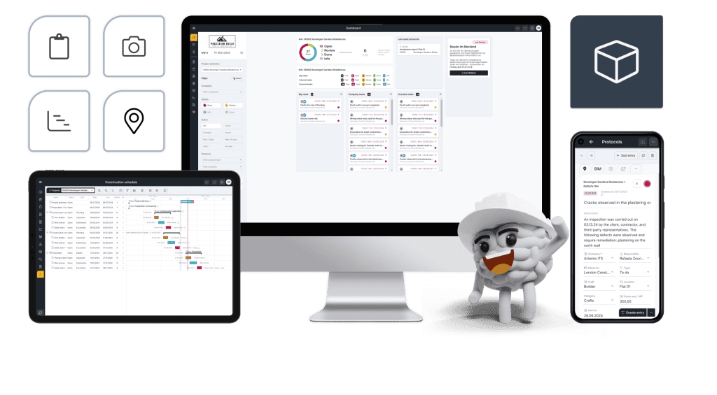 - Project and protocol templates for recurring processes and clear structures in the building process.