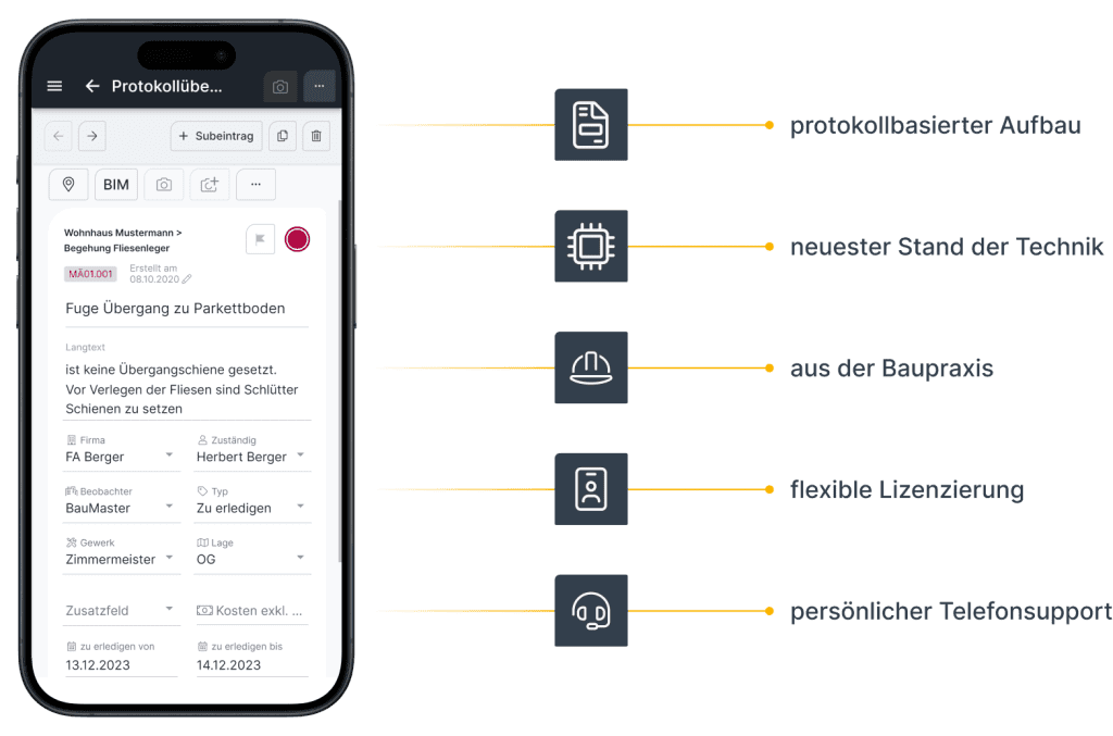 BauMaster lässt sich in allen Bau- und Leistungsphasen einsetzen, wodurch Sie den gesamten Projektverlauf hindurch profitieren – von der Vorbereitung bis zur abschließenden Auswertung. Zusätzliche Vorteile wie effizienteres Mängelmanagement und die Vermeidung von Rechtsstreitigkeiten durch lückenlose Dokumentation sind dabei noch gar nicht berücksichtigt. Diese Aspekte sind in ihrem Wert kaum zu beziffern.